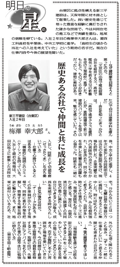 当社若手社員が建通新聞11月4日付朝刊第1面の「明日の星」コーナーで取り上げられました。