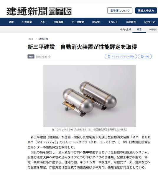 建通新聞電子版(2025年9月16日付)に当社が開発した住宅用下方放出型自動消火装置